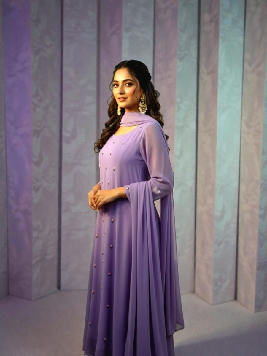 A model in blue traditional Indian attire poses elegantly indoors, highlighting fashion and cultural beauty.
