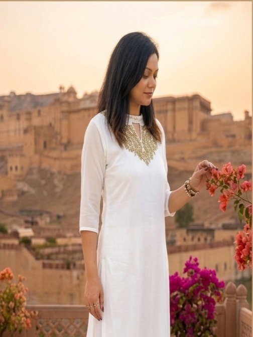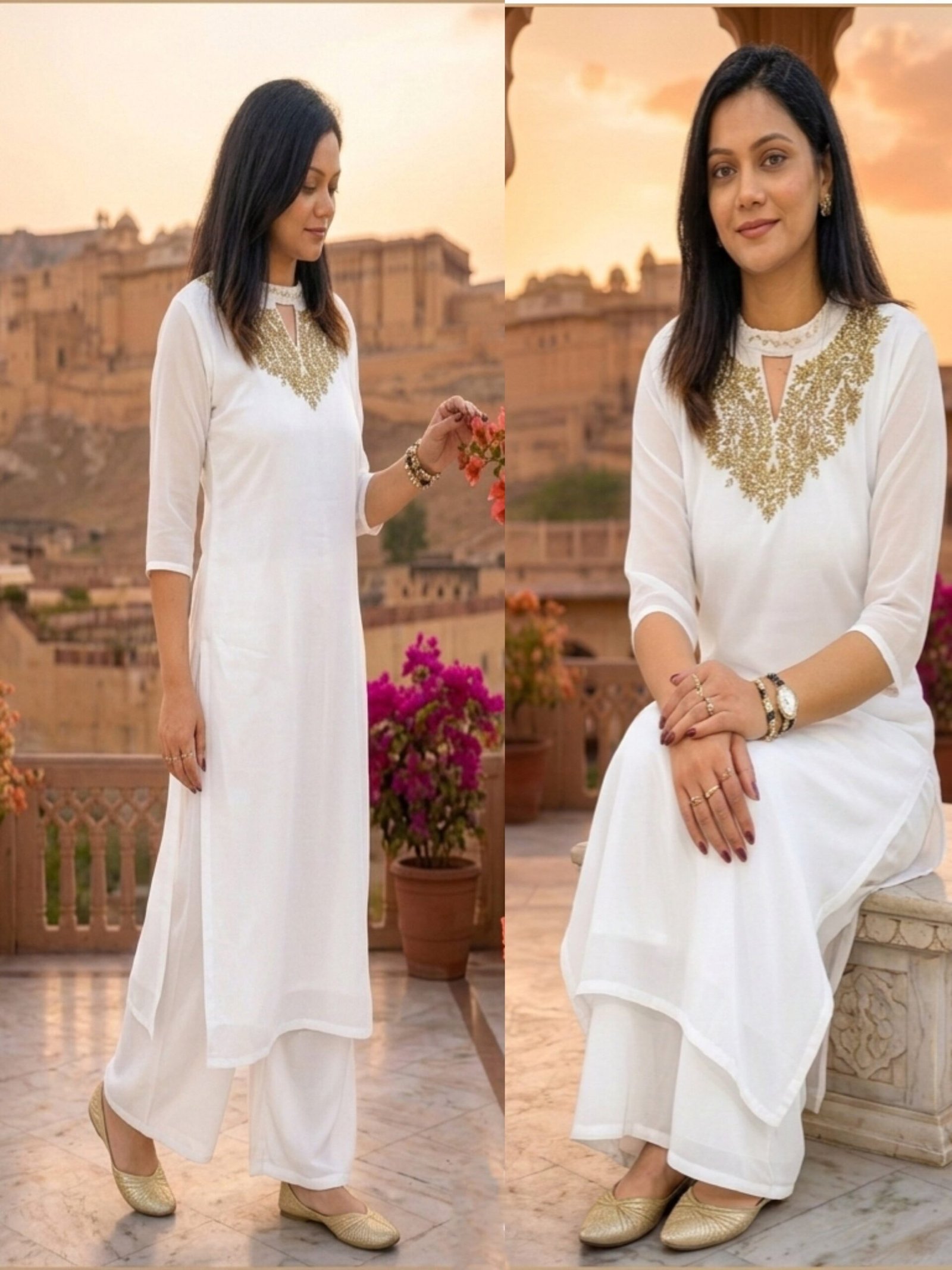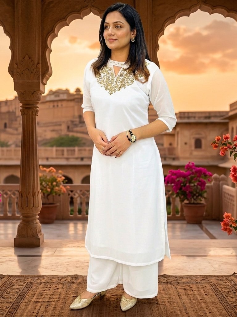 Georgette Kurti with beads work on Yoke and sleeve ends.