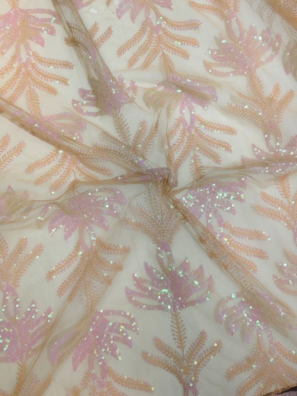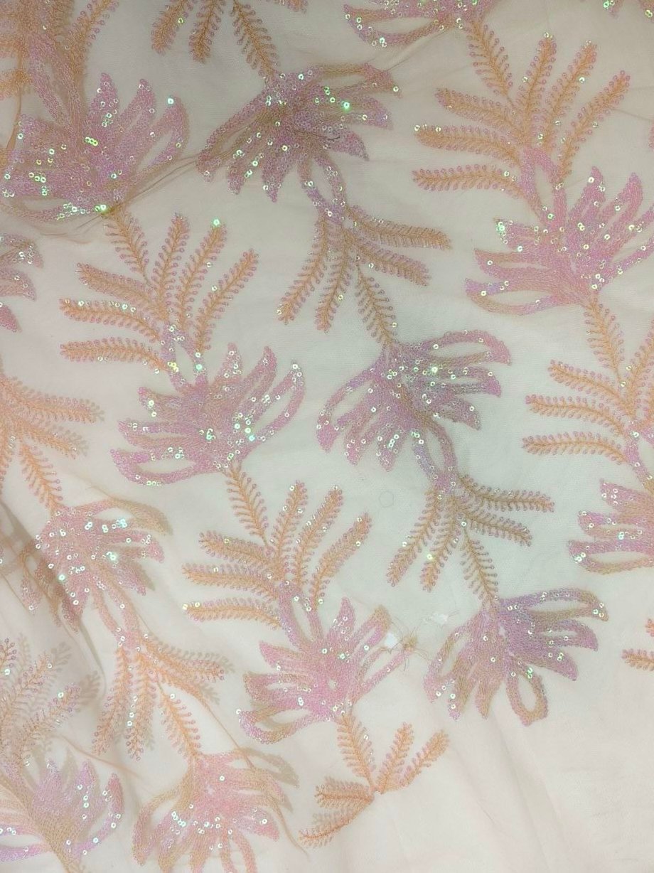 Thread and sequence embroidery on net fabric.